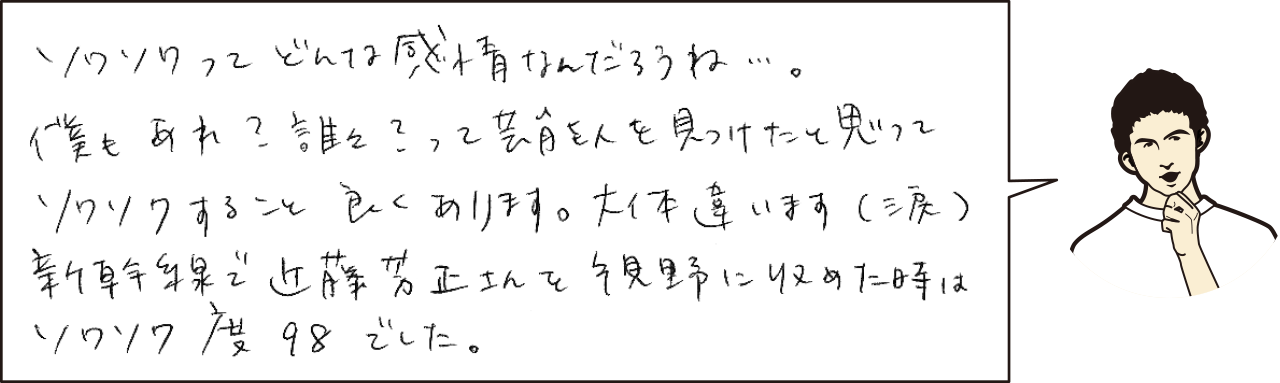 街中で彫りが深くて、髭をたくわえた男性を見ると、「えっ、堅さん?!」とソワソワしてしまいます。(※残念ながら、いつも別人です。)堅さんは、思わずソワソワしちゃうことありますか? |