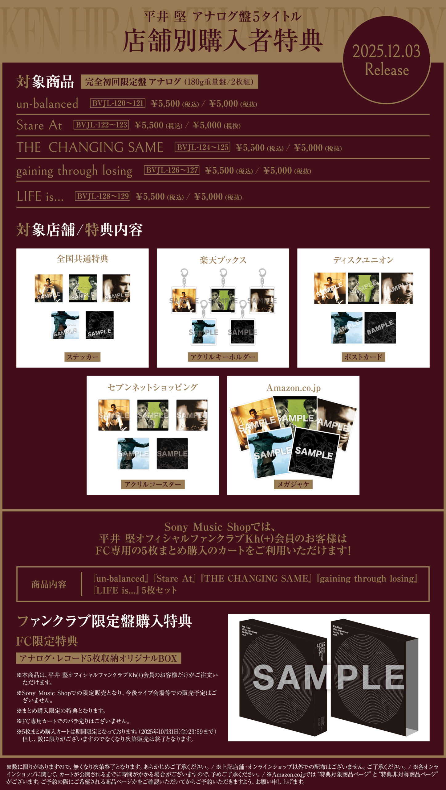 2025年12月3日(水)発売 平井堅デビュー30th アニバーサリー企画の『un-balanced』、『Stare At』、『THE CHANGING SAME』、『gaining through losing』、『LIFE is...』のアナログ・レコード購入特典の絵柄が決定しました!